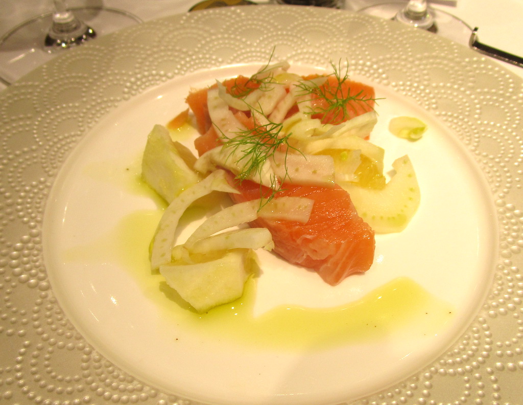 西米良サーモンの43度調理と日向夏とフェンネルとバジルオイル